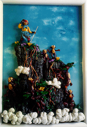 MONKEY DOMAIN The legend of the monkey god living in his domain 'Hua Kwa San' with his fellow monkeys. Picture frame with glass panel & Polymer clay Size: 3.0x6.0 inches Back