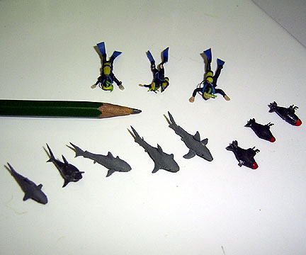 More display of the world's smallest Aquafloats, scuba divers, sharks and submarine,