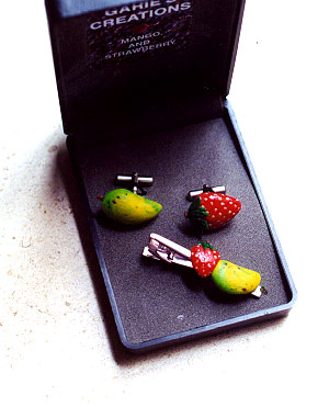 Created a personal gift . She was looking for unusual cuff links, but could not find any, she requested for the custom made cuff link as a special gift for a friend, each side is represented by their favourite fruit, harmonized together by the tie clip. |