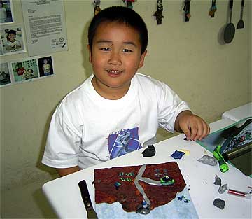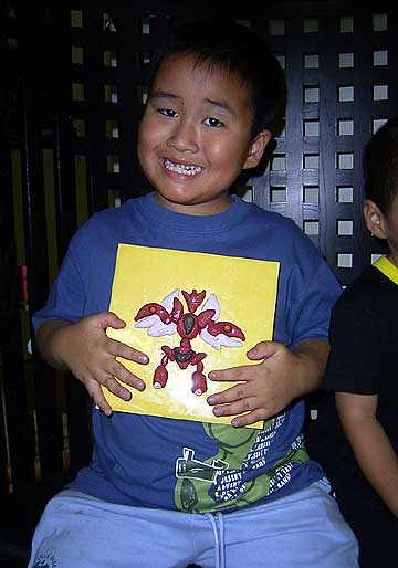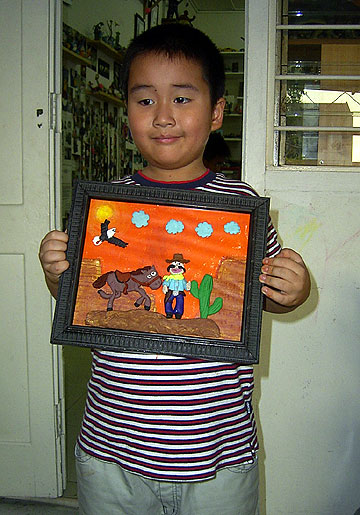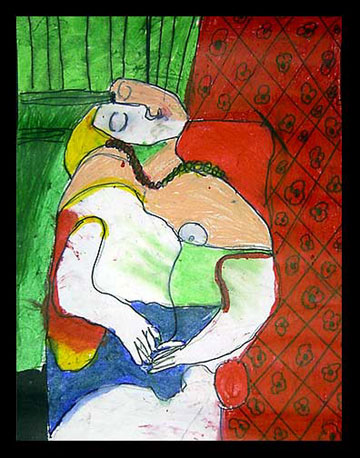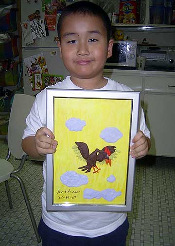 " Every child is an artist. The problem is how to remain an artist once he grows up." Pablo Picasso, painter and Sculptor (1881-1973) Children are vibrant, active, colorful and imaginative, it is best to harness their creativity while they are still young. When they reached adulthood they loose that creative child essence. Famous abstract painter execute their arts with that child like essence, spontaneous and free from any restriction. That is why Pablo Picasso Said: "It takes a very long time to become young." The same sentiment is also shared by English painter David Hockney, "When you're very young, you suddenly find this marvellous freedom, it's quite exciting, and you're prepared to do anything." As Mentor, I merely taking advantage of their young perception and thinking to develop their artistic creativity. Exposing them to the famous abstract modern painters, Picasso, Miro, Klee, Matisse, Dali, Calder, kandinsky, Munch, Gorky ...........have help many of them to improve and appriciate the Arts.Arthur Tan have been taking Drawing and Play Clay lesson since 2001, when he was four and the half years old. He is now a very confident kid, creating his own ideas, both in drawing and clay. Asking him to visually study the famous master work he copied and produced it with interesting result.