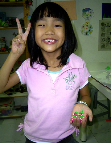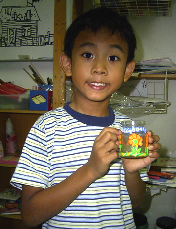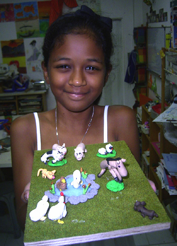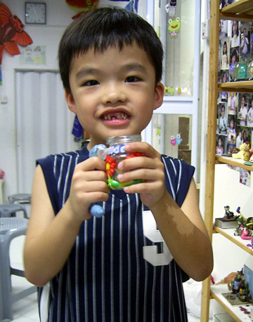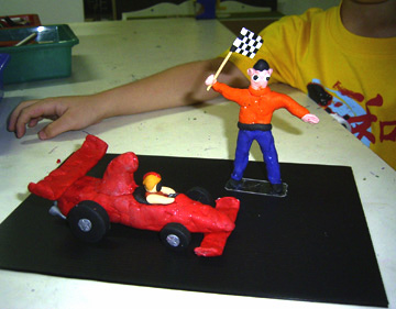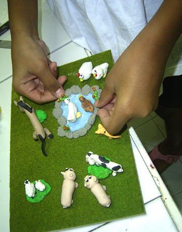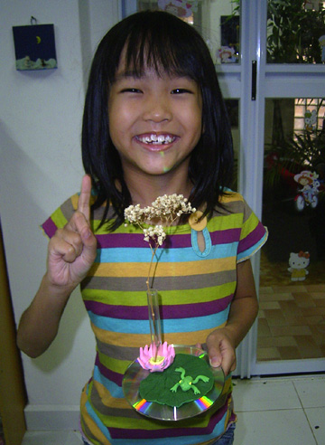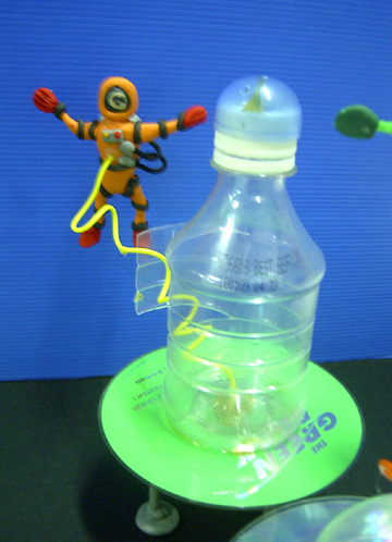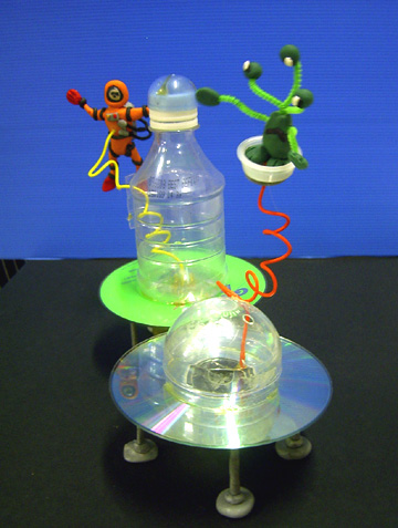 Teaching Kyes to recycle bottle, globes, wires, toothpicks, cds, bottle caps, polymer clay and pipe cleaners to create Alien and Astronaut.