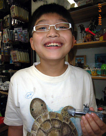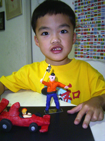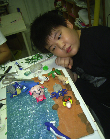 Bradley creating Pokemon Diorama, polymer clay, learning to create water with foils and plywood base
