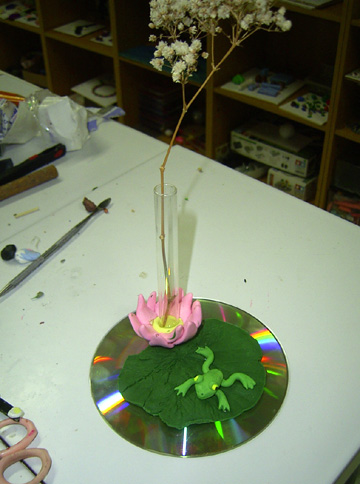 Closer view of the frog on the lotus leaf, test tube flower vase on cds.