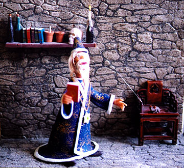 The Wizard with his magic book is going to conjure his mystical power, to connect himself to the internet. Detailed figure constructed in polymer clay with glow in the dark pendant, while his tiny friend is waiting to watch him perform his magical power. |