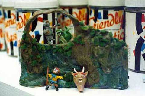 This is a motorized miniature theater made from the plastic, character in the play are, Wu Khong vs Nu Mor Wan, knight vs fat dragon, etc