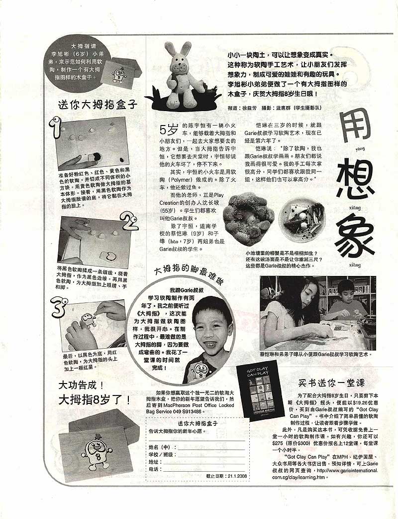 Thumbs Up news magazine featuring Play Clay Workshop on 14/01/2008 - 20/01/2008 by Singapore Press Holdings