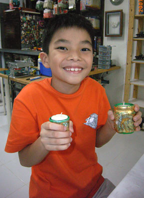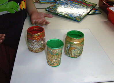 Using pattern foils, metallic powder and texture sheets kids creates candle and pencil holders